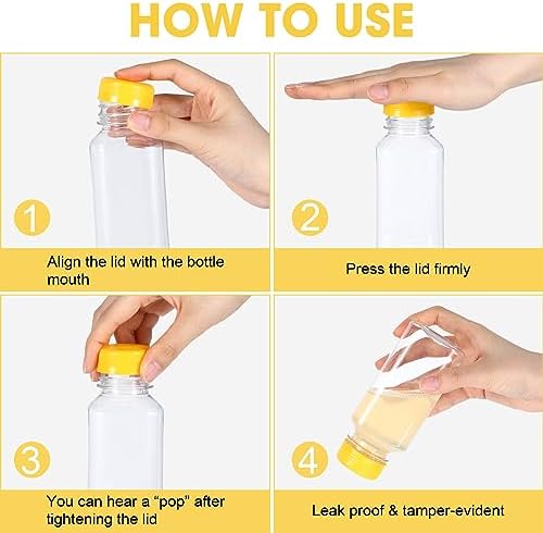 Tamper Proof Top: our juice container have tamper proof top lids with a 38 mm security ring, ensuring that your drinking bottle remains sealed; The tamper evident lids prevent spills, drips, and keep the juice fresh; To ensure a secure seal, push down the lid until you hear a distinct “click” sound, then screw it tightly clockwise