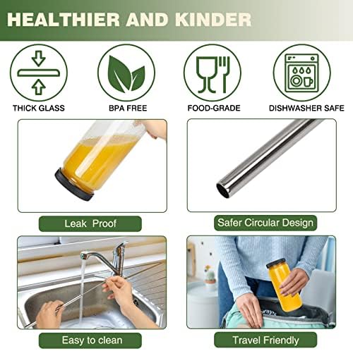 VERSATILE: Glass juice bottles with lids are great for juicing and making various beverage such as fresh juice, bubble tea with boba, smoothies, fruit tea, coffee, milk, and also great for storing honey, nuts, candy and more. The lid with straw hole and straw allow you to enjoy your drinks more comfortably and conveniently.