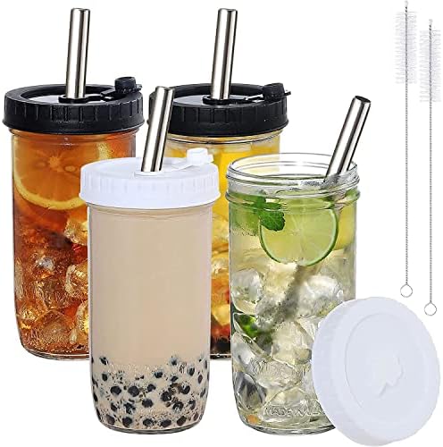 【Super Value Boba Cup Set】The boba cup set Includes 4 wide mouth mason jars 24oz (730ml), 4 plastic mason jar lids, 4 reusable stainless steel straws, 2 straw cleaning brushes.All accesseries are very practical combination suit.