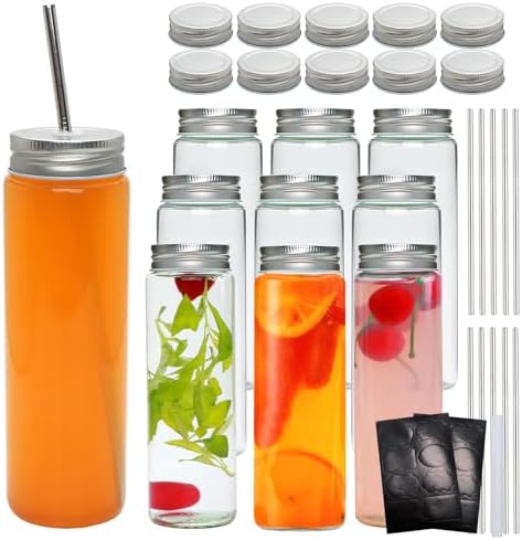 10 Pack Juice Bottles 10 Sliver Airtight Lids10 Sliver Lids with Hole10 Stainless Steel StrawsLabels and 1 Marker