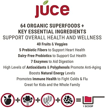Don’t let a busy schedule get in the way of good health. Our fruits and veggies supplement is a delicious & convenient way to boost your nutrient intake with 64 superfoods that are packed with essential vitamins, minerals, and antioxidants. According to the CDC, nine out of ten Americans aren’t eating enough fruits and veggies. Luckily, with JUCE Reds Daily Superfood Powder, consuming the recommended 5-9 servings of fruits and vegetables has never been easier. Each scoop of our superfood powder has a whopping 50+ fruits, vegetables, enzymes, and adaptogens that – unlike synthetic vitamins – contain the whole food micronutrients, fiber, and enzymes your body needs to maximize absorption. Plus, each serving contains an immune boosting blend of 5 prebiotic fibers and 6 strains of living probiotics that support gut health and aid digestion for a happier tummy and a healthier you. At JUCE, we use only the highest quality, farm fresh ingredients that are never GMO. Best of all, they’re grown exclusively on USDA certified organic farms which, studies have shown, produce plants with a richer antioxidant content than their non-organic counterparts.* Our fruit & vegetable supplement is bursting with berry flavor and tastes delicious when added to juices, smoothies, and protein shakes. With a formula that’s non GMO, Dairy Free, Gluten Free, Gelatin Free, Soy Free, and Vegan, this is the perfect veggie supplement for the whole family to enjoy. Don’t wait – give your body the nutrients it needs with JUCE Reds today.